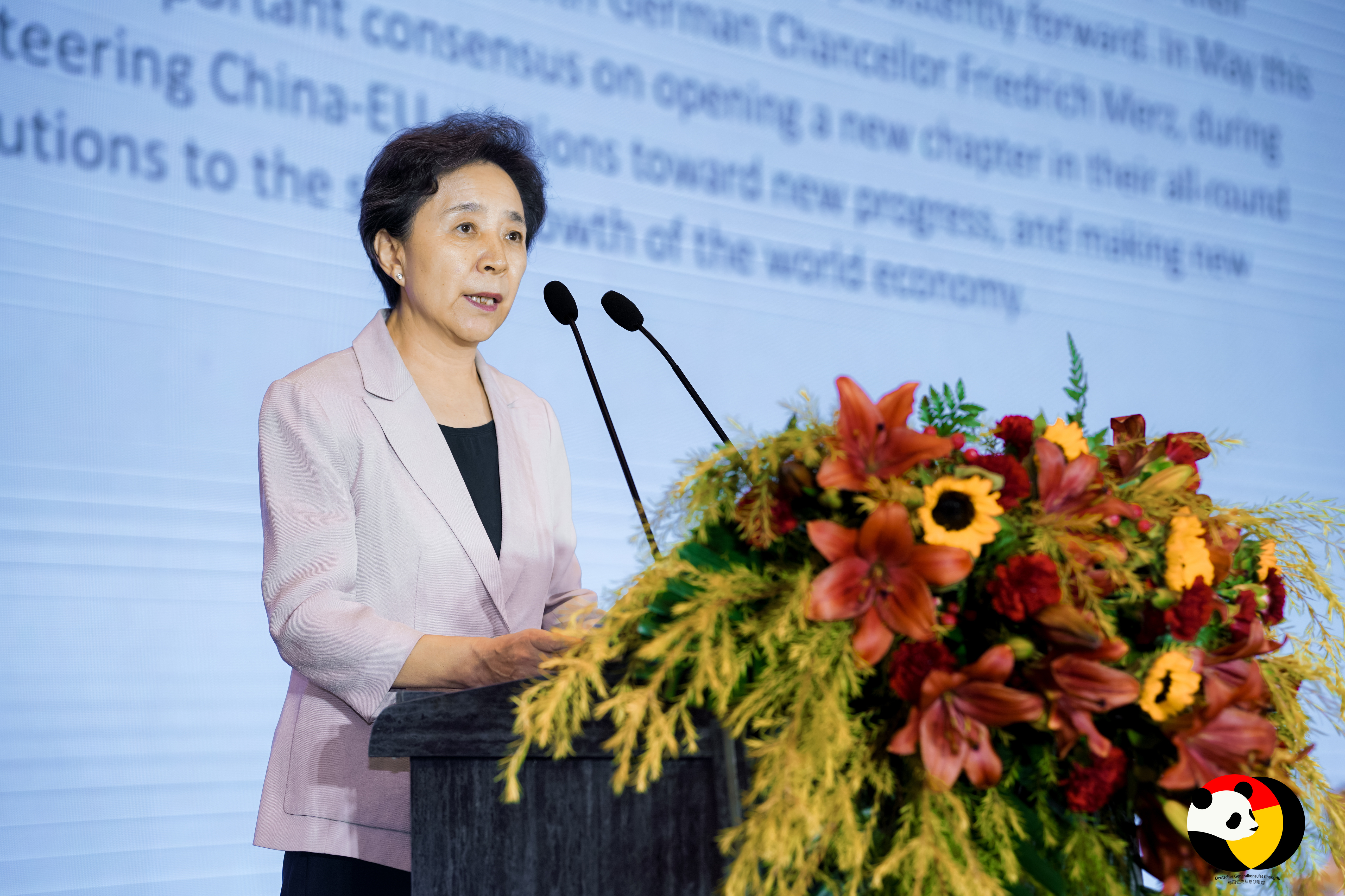 祝春秀副主任在致辞中指出,在稳固的中德关系大背景下,四川与德国经贸合作日益密切,特别是中欧班列(杜伊斯堡—成都)蓉欧速达专列的开通,为双方合作提供了全新快捷通道。